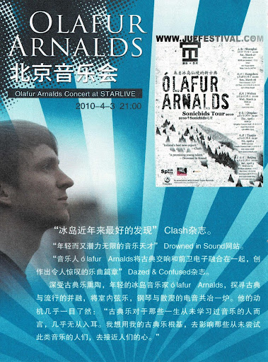 A tour poster for Ólafur Arnalds‘ 8-City tour of China, which we coordinated.